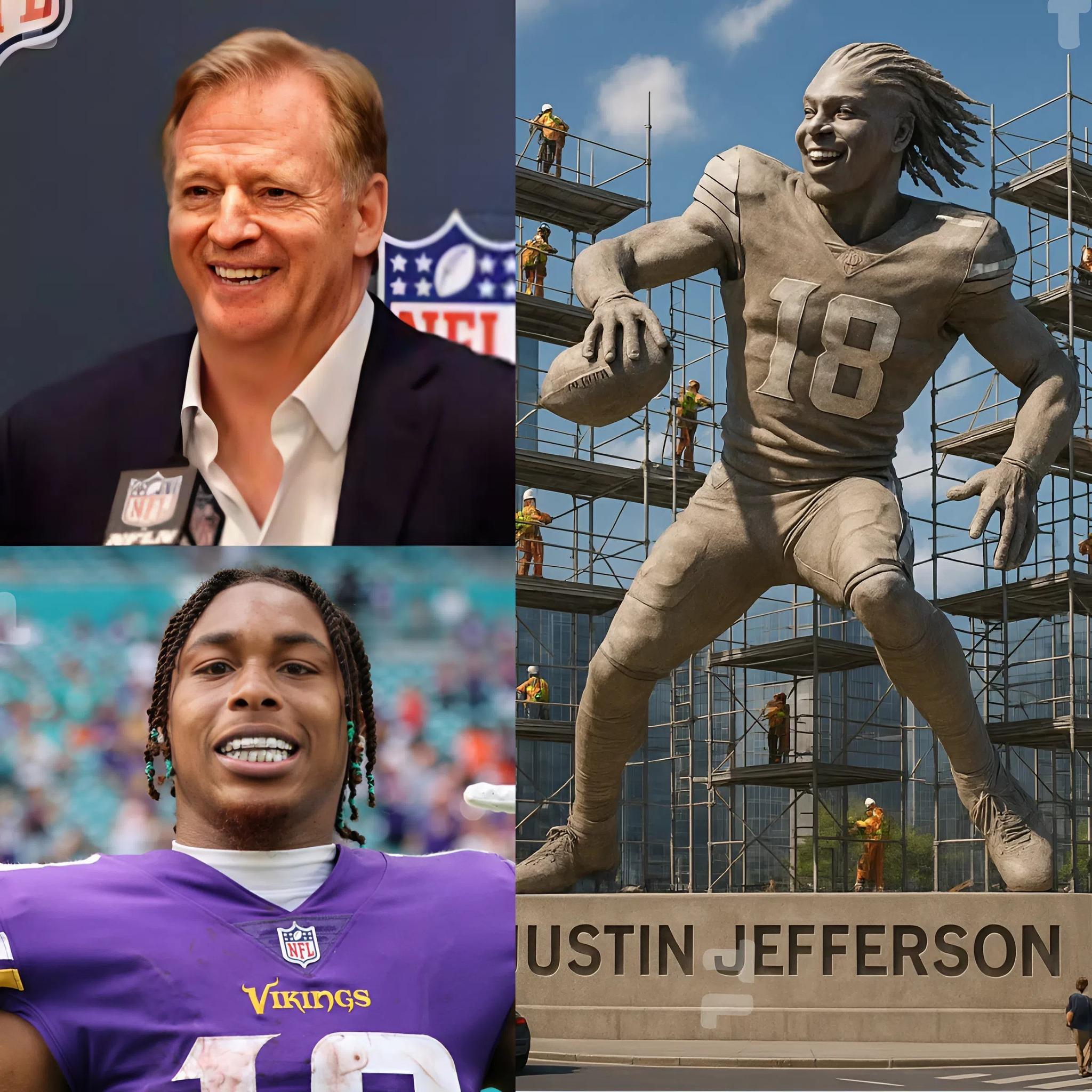 In a moment that will forever be remembered by every Minnesota Vikings fan, the President of the NFL Legends Association took to the podium at U.S. Bank Stadium and made an announcement that sent waves of emotion across the football world. “It’s time to immortalize greatness,” he said, pausing as the crowd went silent. “We will build a statue of Justin Jefferson right here in Minnesota — not just for what he’s done on the field, but for what he represents off it.” The stadium exploded in cheers, tears, and chants of “JJ! JJ! JJ!” echoing through the stands as Justin Jefferson stood there, visibly moved, his hands covering his face