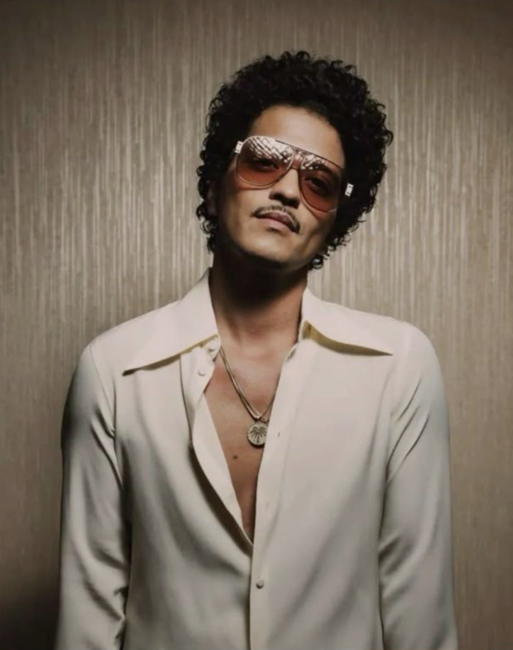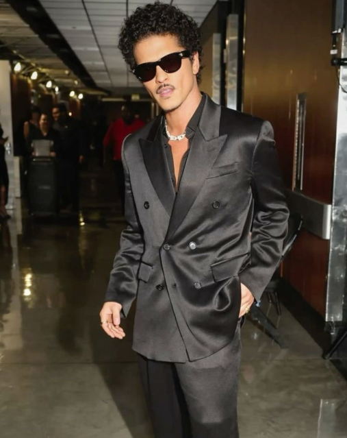 🔥 The 2025 Bruno Mars look blends old-school sophistication with new-age swagger: silk shirts unbuttoned to mid-chest, vintage gold chains, tailored bell-bottom suits, and tinted sunglasses that shimmer under the lights. It’s retro, it’s modern, it’s Bruno — and it’s taking over the fashion world.