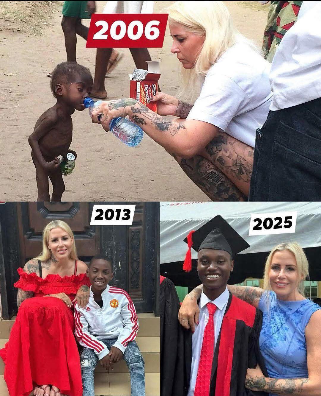 In 2006, the world was shaken by a single haunting image. A frail Nigerian boy, starving and abandoned, was crouched on the street as a compassionate British aid worker bent down to offer him water and food. That moment captured not just a child’s desperate fight for survival, but also the essence of humanity — the power of kindness to reach into the darkest corners of despair. Millions saw the photo, but very few imagined what would come next.