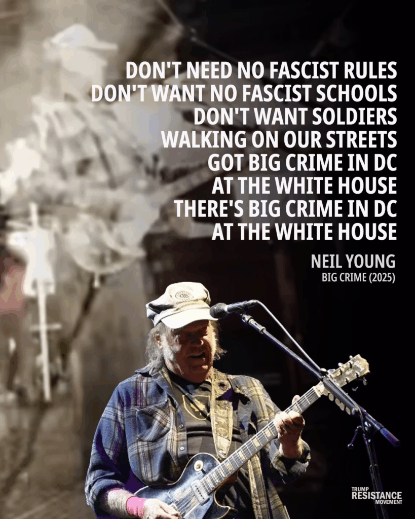 For decades, Young has been the voice of resistance, weaving protest into melody. Yet in “Big Crime,” there’s no metaphor to decode, no veil of poetry to soften the blow. Instead, his voice cuts straight to the bone. From the opening chords, the song tears into the state of American leadership with a raw fury that refuses to be ignored. The lyrics pull no punches: “Don’t need no fascist rules / Don’t want no fascist schools / Don’t want soldiers on our streets.” These lines don’t just sing — they demand, they accuse, they warn.