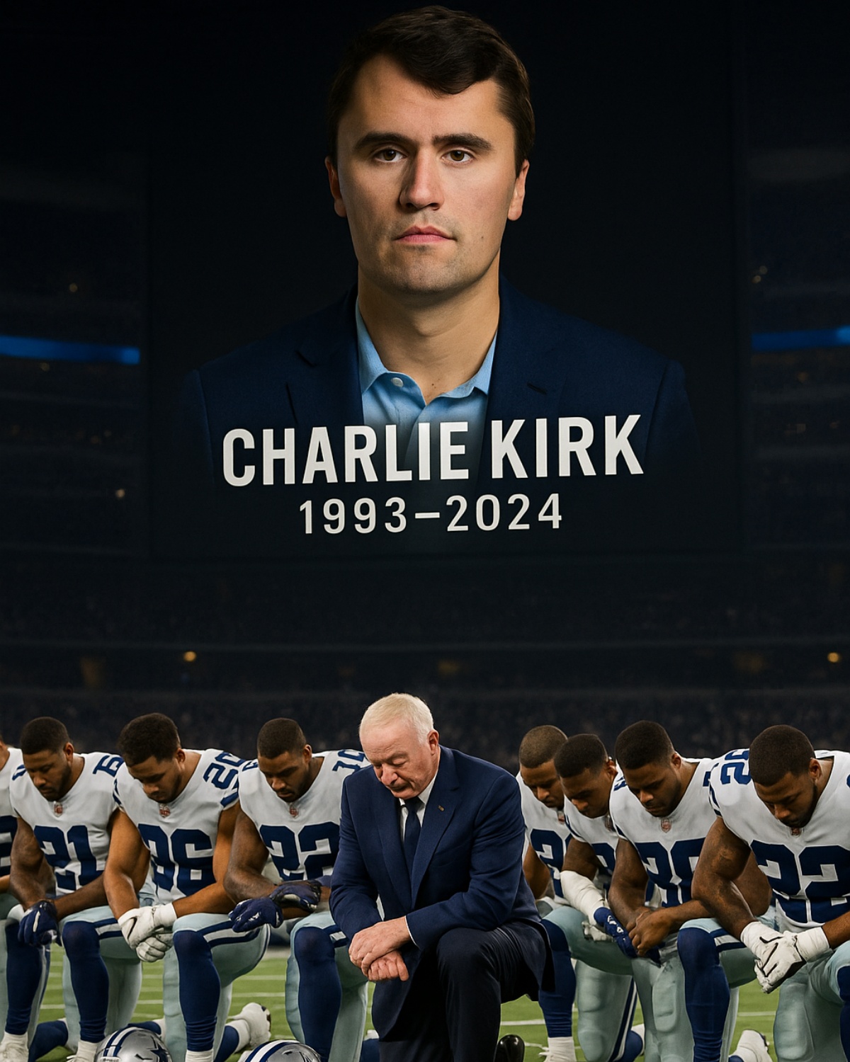 That night, television replays of the halftime kneel ran again — the image of Jones lowering his hat, the team surrounding him, and Charlie Kirk’s face illuminated above them like a ghost in the light.