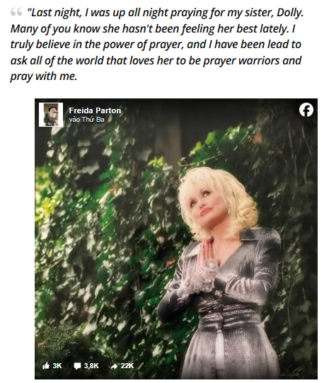 “Last night, I was up all night praying for my sister, Dolly. Many of you know she hasn’t been feeling her best lately. I truly believe in the power of prayer, and I have been lead to ask all of the world that loves her to be prayer warriors and pray with me.