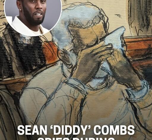 In this courtroom sketch, Sean Diddy Combs breaks down and cries during the playing of a video about his life during his sentencing hearing in Manhattan federal court, Friday, Oct. 3, 2025, in New York.(Elizabeth Williams | Elizabeth Williams via AP)