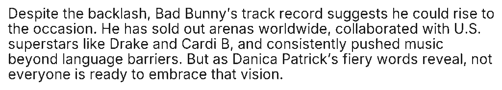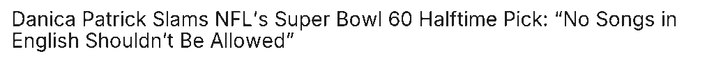 BB.Danica Patrick Slams NFL’s Super Bowl 60 Halftime Pick: “No Songs in English Shouldn’t Be Allowed”
