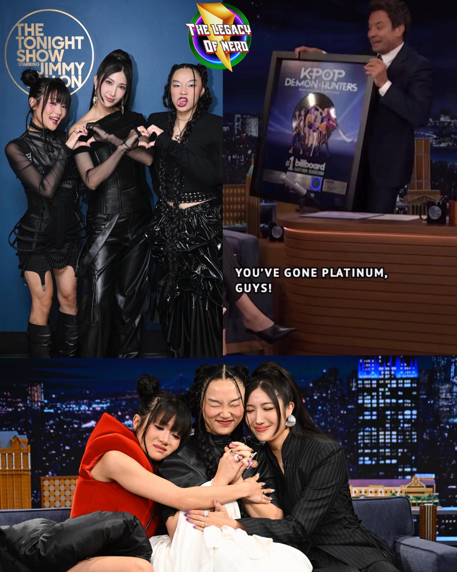 In the electric haze of Studio 6B, where the ghosts of late-night legends linger in the rafters and the audience’s laughter echoes like a chorus of concealed confessions, October 7, 2025, delivered a revelation that should have sparkled like stardust—or shattered like a mirror in a haunted hall. Jimmy Fallon, the eternal boyish bard of bedtime TV, leaned into the spotlight during The Tonight Show with a grin that masked mysteries untold, surprising EJAE, Audrey Nuna, and Rei Ami—the ethereal voices animating the fictional K-pop phenom HUNTR/X in Netflix’s K-Pop Demon Hunters—with news that their soundtrack had clawed its way to platinum status. One million units shifted, certified by the RIAA’s cold, calculating seal, transforming these rising sirens into “Platinum Recording Artists” in a confetti cascade that lit up screens worldwide. EJAE’s gasp pierced the air like a high note held too long, Nuna’s enigmatic smile flickered like a faulty neon sign, and Rei Ami’s frozen poise cracked just enough to hint at the storm beneath. The crowd roared, socials exploded—#HuntrXPlatinum trending with 3 million impressions by midnight—and the trio’s live debut of “Golden” pulsed with triumphant timbre. But pause the playback, dear viewer, and peer past the pyrotechnics: What if this platinum plaque isn’t a pinnacle, but a portal? A shimmering threshold where animated idols bleed into reality, and the “demon hunters” of the title hunt not just spectral foes, but the fragile psyches of those who summon them? As the certification’s glow fades into the witching hour, whispers worm their way in: Is this ascension a siren song of success… or the subtle snare of something supernatural, where voices like theirs echo eternally, unbound and unblinking?