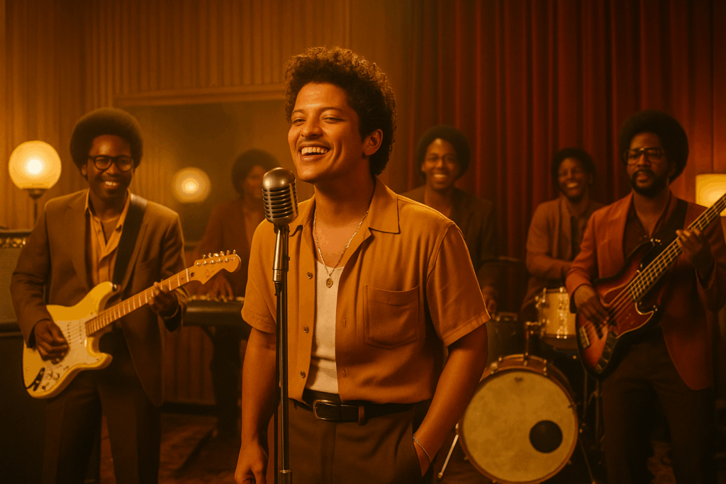 The video, shot in golden hues and smooth slow-motion, captures Bruno rehearsing in a vintage studio, surrounded by his band and bursts of laughter. Between melodies, he leans into the mic, closes his eyes, and lets out that soulful tone that made him a global icon.