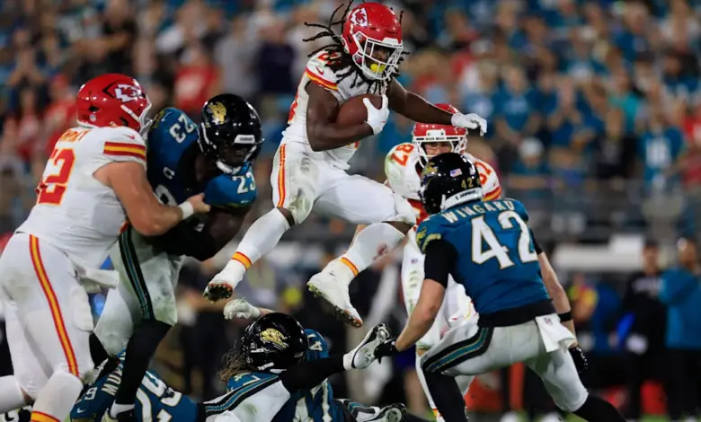 • Kansas City Chiefs running back Kareem Hunt (29) scores a rushing touchdown during the fourth quarter of an NFL football matchup at EverBank Stadium, Monday, Oct. 6, 2025, in Jacksonville, Fla. The Jacksonville Jaguars edged the Kansas City Chiefs 31-28. [Corey Perrine/Florida Times-Union] / Corey Perrine/Florida Times-Union / USA TODAY NETWORK via Imagn Images