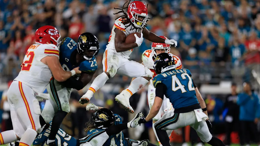 - Kansas City Chiefs running back Kareem Hunt (29) scores a rushing touchdown during the fourth quarter of an NFL football matchup at EverBank Stadium, Monday, Oct. 6, 2025, in Jacksonville, Fla. The Jacksonville Jaguars edged the Kansas City Chiefs 31-28. [Corey Perrine/Florida Times-Union] / Corey Perrine/Florida Times-Union / USA TODAY NETWORK via Imagn Images