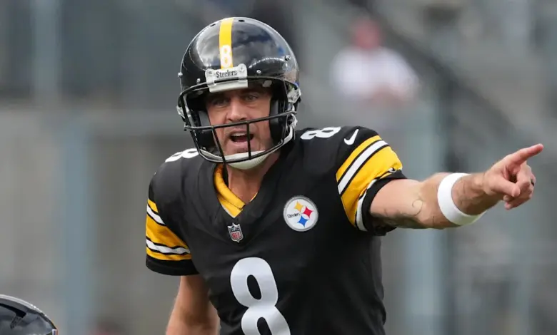 • Sep 28, 2025; Dublin, Ireland; Pittsburgh Steelers quarterback Aaron Rodgers (8) gestures against the Minnesota Vikings during an NFL International Series game at Croke Park. Mandatory Credit: Kirby Lee-Imagn Images / Kirby Lee-Imagn Images