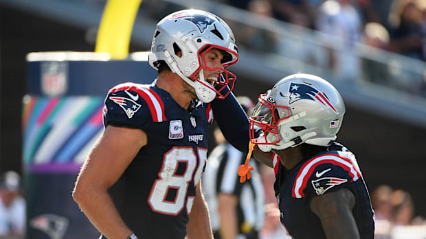 - Sep 28, 2025; Foxborough, Massachusetts, USA; New England Patriots tight end Hunter Henry (85) reacts with wide receiver Stefon Diggs (8) after scoring a touchdown during the second half at Gillette Stadium. Mandatory Credit: Bob DeChiara-Imagn Images / Bob DeChiara-Imagn Images