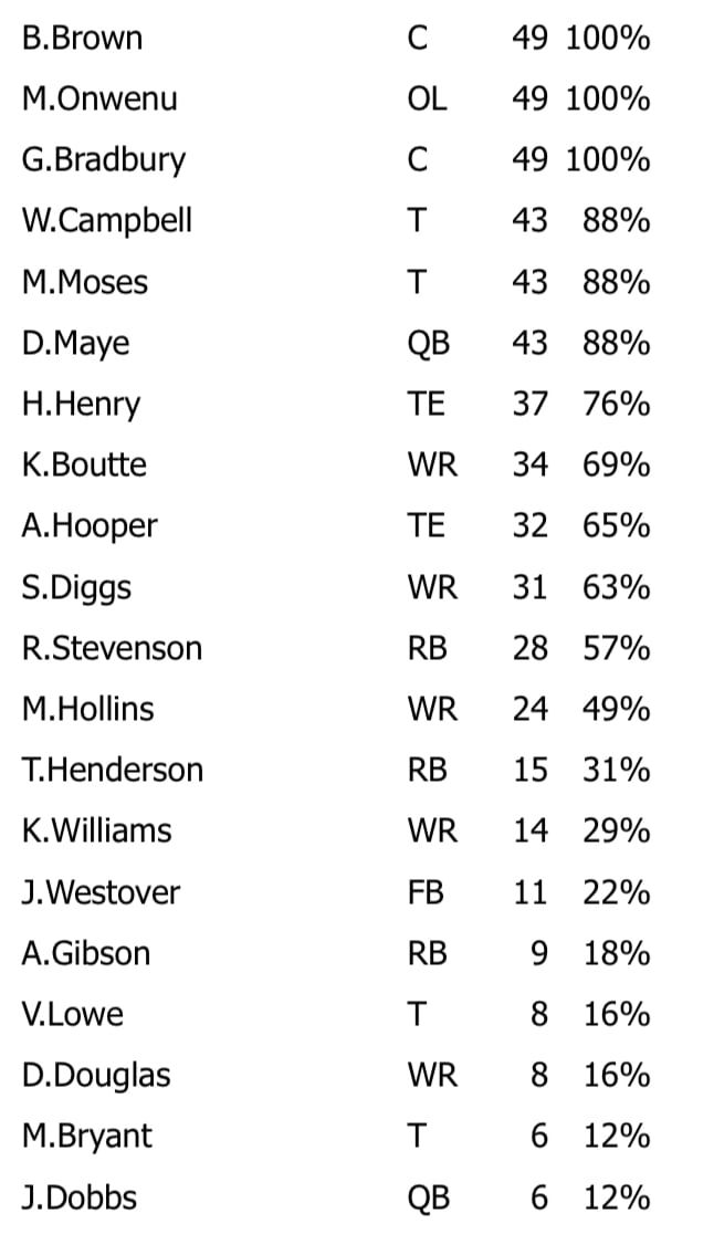 The Pats were undoublestly pleased with their effort in all three phases, allowing them to secure their first home victory of the season — and the first under head coach Mike Vrabel. However, there are plenty of areas in which they will look to build upon as well as seek improvement. Though game-film analysis will be the main focus, a look at playing time may assist the Pats in helping to devise effective strategies moving forward.