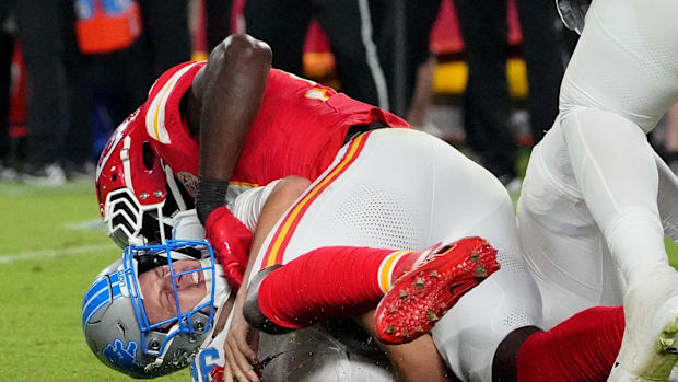 Detroit Lions defensive end Aidan Hutchinson (97) knocks the ball out of the hands of Kansas City Chiefs quarterback Patrick Mahomes (15) during the first half at Arrowhead Stadium in Kansas City, Missouri on Sunday, Oct. 12, 2025. / Junfu Han / USA TODAY NETWORK via Imagn Images