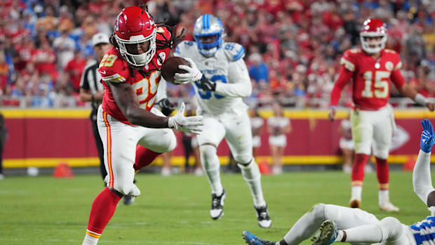 • Oct 12, 2025; Kansas City, Missouri, USA; Kansas City Chiefs running back Kareem Hunt (29) rushes the ball against the Detroit Lions during the second half at GEHA Field at Arrowhead Stadium. Mandatory Credit: Denny Medley-Imagn Images / Denny Medley-Imagn Images