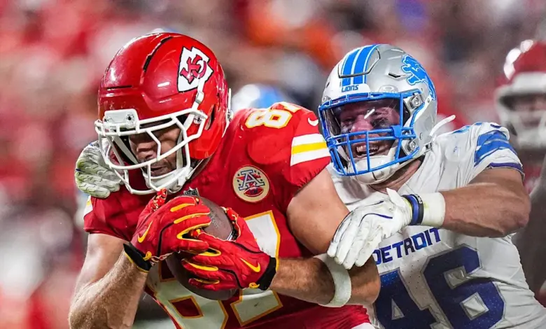 • Detroit Lions linebacker Jack Campbell (46) tackles Kansas City Chiefs tight end Travis Kelce (87) during the second half at Arrowhead Stadium in Kansas City, Missouri on Sunday, Oct. 12, 2025. / Junfu Han / USA TODAY NETWORK via Imagn Images