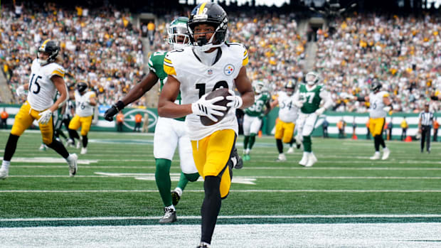 • Pittsburgh Steelers wide receiver Calvin Austin III (19) scores a touchdown in the fourth quarter, Sunday, September 7, 2025, in East Rutherford. / Kevin R. Wexler-NorthJersey.com / USA TODAY NETWORK via Imagn Images