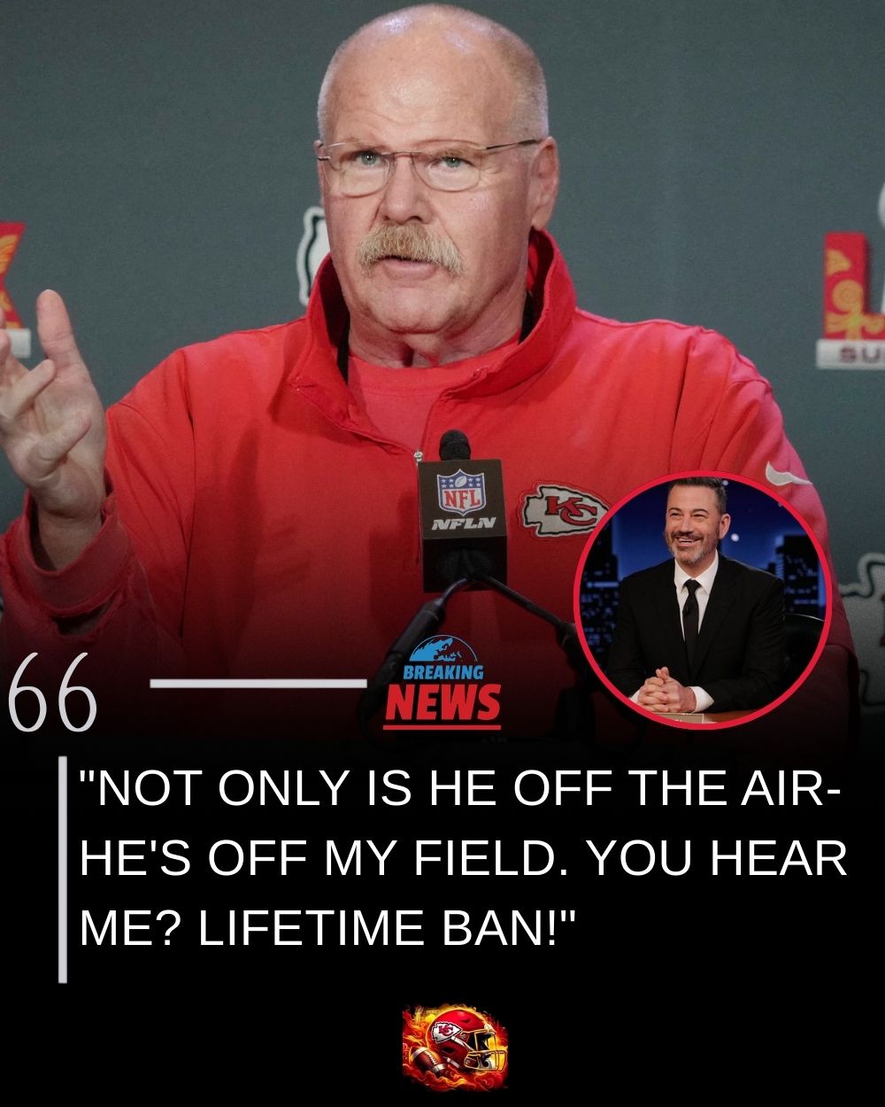 Head Coach Andy Reid has stunned both fans and Hollywood with his shocking declaration: “Jimmy Kimmel is banned for life from my stadium!”