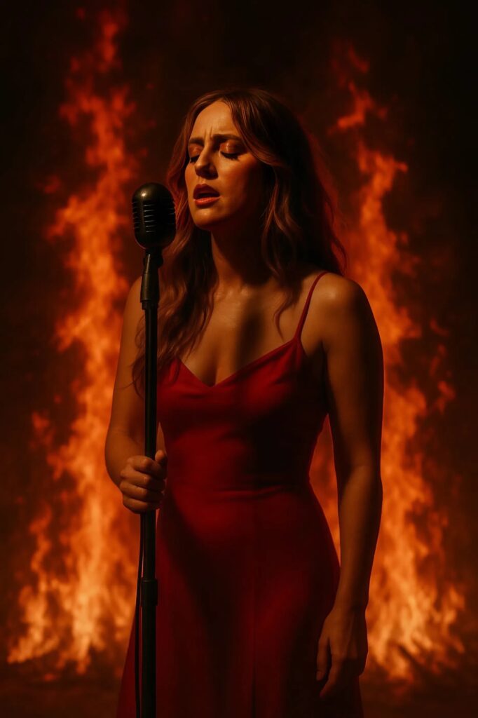 The video opens quietly — a single guitar note, a whisper of wind, and Lainey’s silhouette framed in light. But as the song unfolds, it builds into a visual and emotional explosion. Her voice, smoky and soul-soaked, rises over crashing thunder as the camera moves through scenes that feel almost autobiographical. We see her walking away from a burning truck, sitting alone in a neon-lit diner, standing in the rain as lightning splits the sky — each moment symbolic, each one carrying layers of meaning.