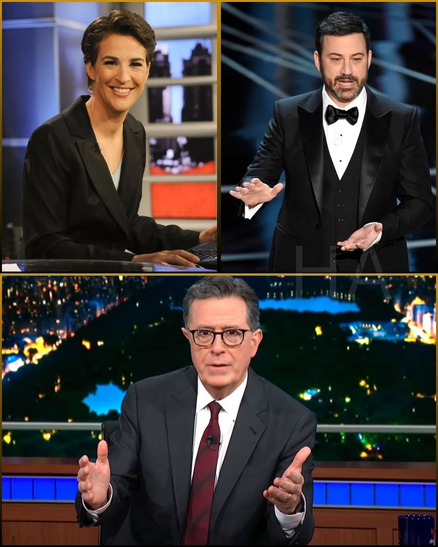 For decades, American audiences have trusted familiar faces to guide them through the nightly noise of politics, culture, and controversy. Rachel Maddow, Stephen Colbert, and Jimmy Kimmel each carved out their place in this ecosystem: Maddow as MSNBC’s intellectual anchor, Colbert as the satirist-turned-king of late-night, and Kimmel as the mainstream jester willing to spar with anyone. Together, they commanded millions of viewers and held enormous influence across the media landscape.