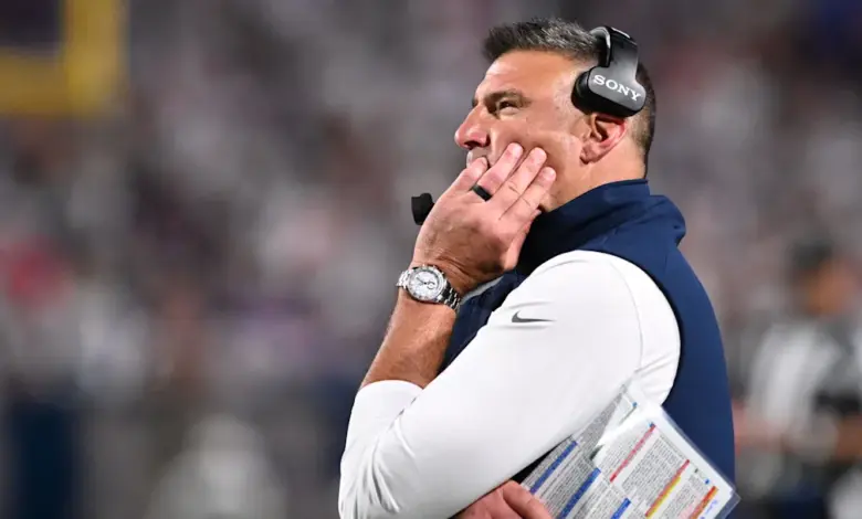 - Oct 5, 2025; Orchard Park, New York, USA; New England Patriots head coach Mike Vrabel reacts during the second half at Highmark Stadium. Mandatory Credit: Mark Konezny-Imagn Images / Mark Konezny-Imagn Images