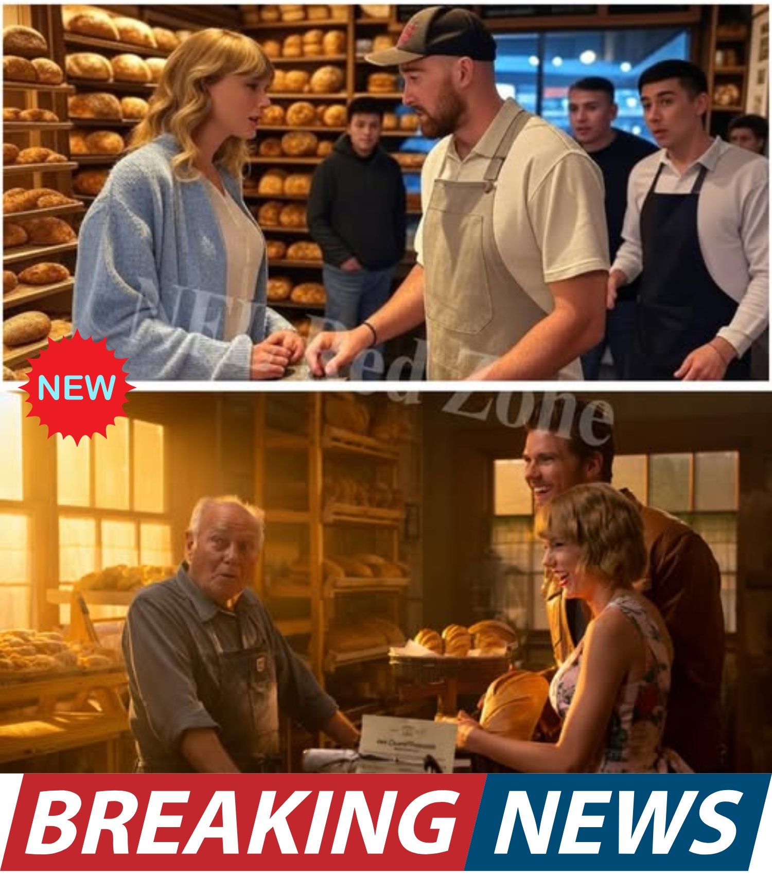 Word spread like wildfire through the town. By noon, Millford’s single traffic light was backed up with cars honking in celebration. Social media exploded as locals posted photos of the couple’s visit, piecing together the puzzle. A grainy cell phone video captured Taylor hugging Elias goodbye, and Travis hoisting a box of donuts like a trophy. Hashtags like #SwiftSavesBakery and #KelceHearthHero trended nationwide within hours.