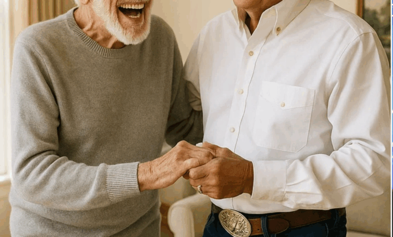 White shirt, cowboy hat, and that quiet strength only time and truth can give. He walked up to Dick, extended his hand… and what followed wasn’t just a handshake. It was a duet without words. The kind of unspoken harmony that only two men—one from Broadway, one from country roads—could create.