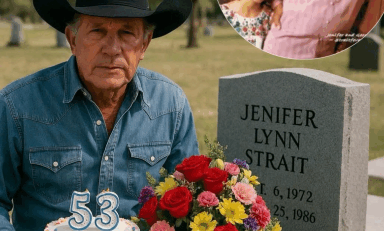 Today, country legend George Strait returns quietly to the resting place of his beloved daughter, Jenifer Strait. In his hands, he carries a small bouquet — simple, tender, and filled with the weight of unspoken words. The morning air is still, and the wind moves gently through the trees, as if carrying echoes of laughter long gone. Standing before the headstone, George says nothing. He doesn’t need to. His silence speaks of thirty years of love, sorrow, and the eternal bond between a father and his child.