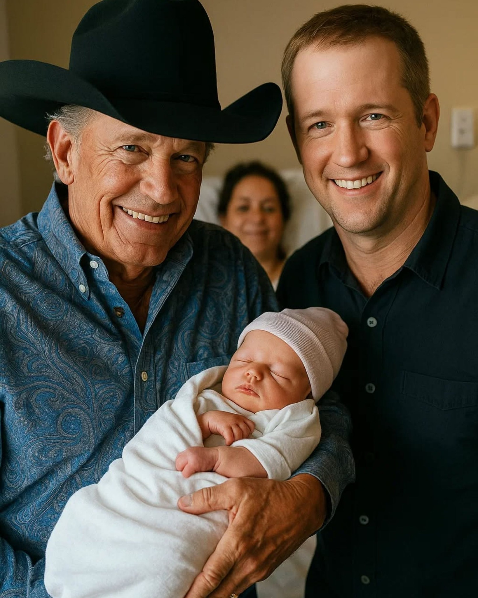 For George, this birth symbolized more than just a new addition — it represented the continuation of a family legacy. The 72-year-old icon, who has spent over forty years at the top of country music, entered the hospital room quietly, carrying a bouquet of flowers and his trademark cowboy hat. Witnesses recall him whispering a short prayer of thanks before gently kissing his new grandchild’s forehead.