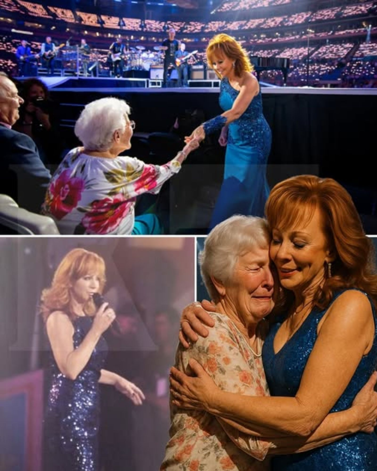 As fans leaned forward in anticipation, they noticed who had caught her attention — an elderly woman sitting alone in the front row. Her silver hair shimmered under the lights, her eyes filled with quiet strength and decades of stories untold. Reba knelt before her, gently took her trembling hand, and guided her toward the stage.