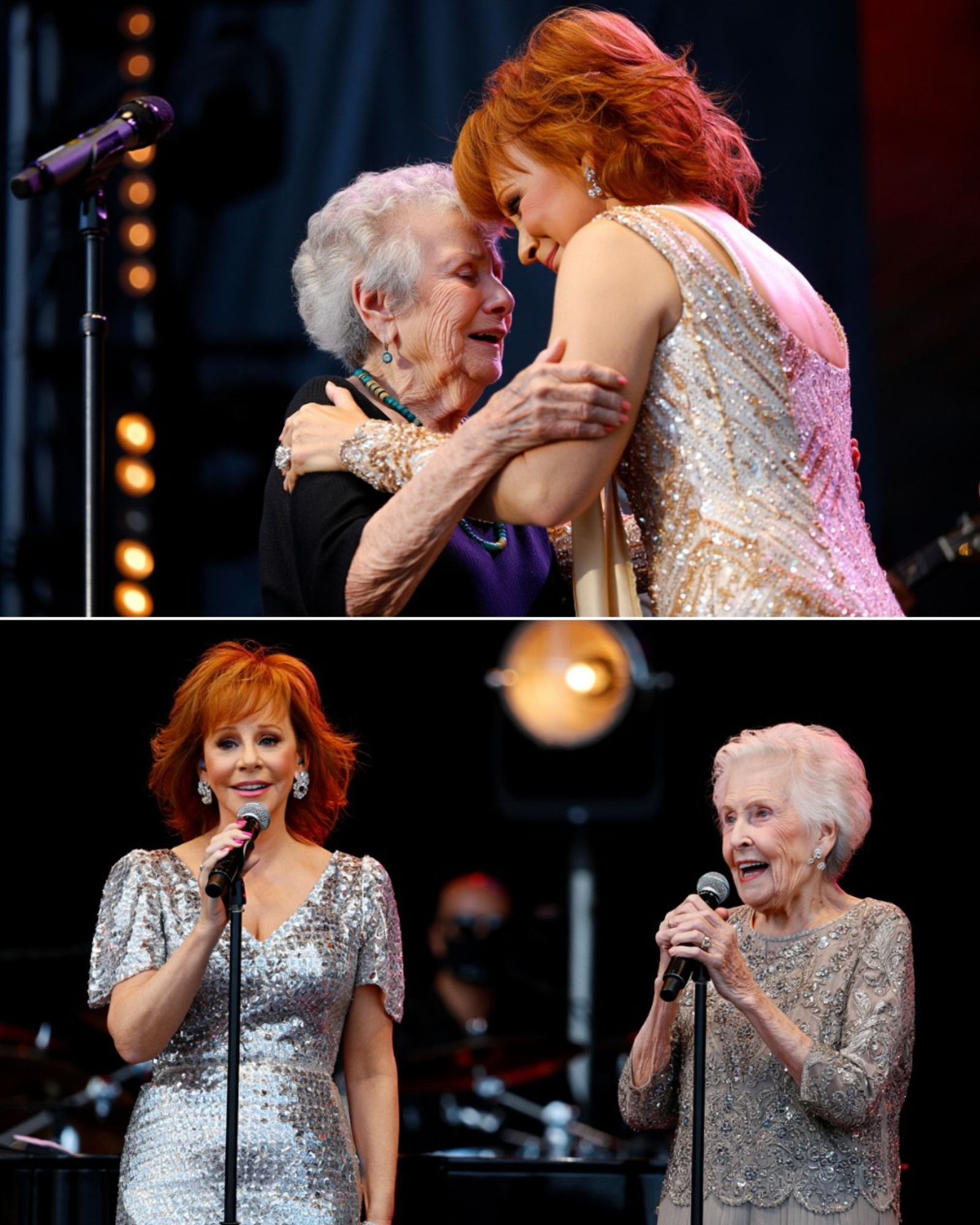Back in the gentle glow of the stage lights, Reba knelt beside the woman, whispering something that only the two of them will ever know. Then, she wrapped her arms around her in a long, tender embrace. The woman began to weep, her tears a mixture of shock, joy, and the overwhelming feeling of being truly seen. As they held each other, the 30,000-strong crowd rose to their feet, not in a wild cheer, but in a reverent, unified standing ovation.