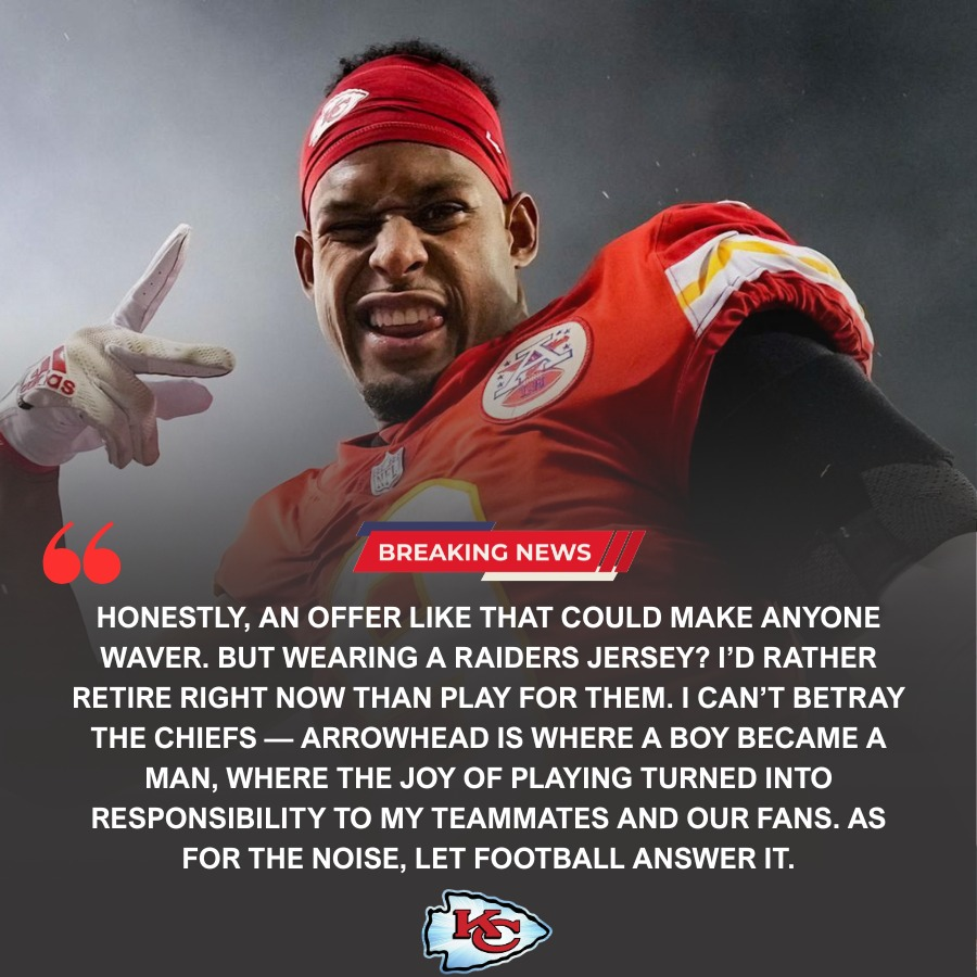 “Honestly, an offer like that could make anyone waver. But wearing a Raiders jersey? I’d rather retire right now than play for them. I can’t betray the Chiefs — Arrowhead is where a boy became a man, where the joy of playing turned into responsibility to my teammates and our fans. As for the noise, let football answer it.”