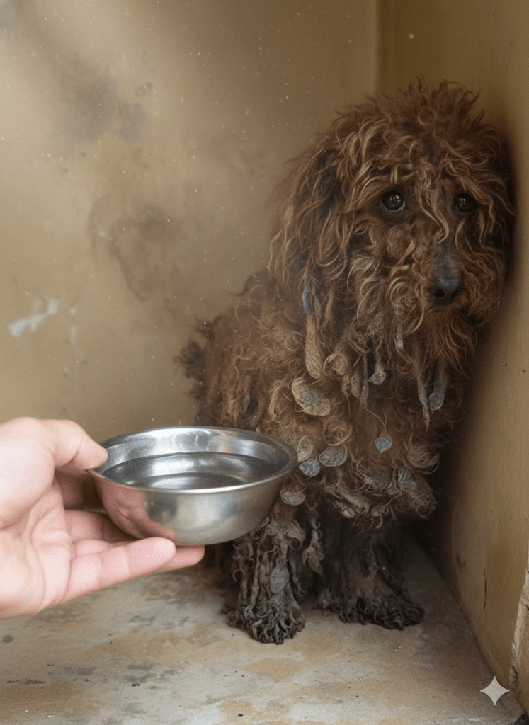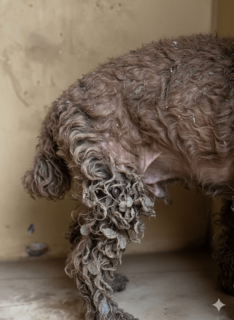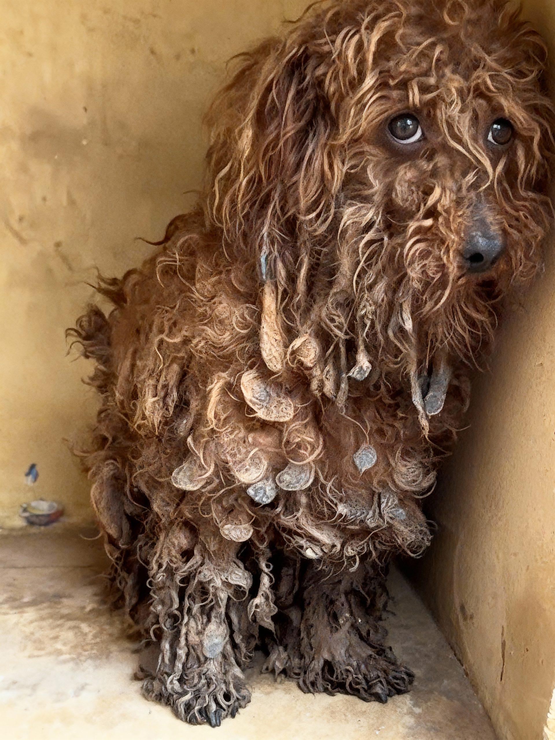 The image before us is a stark and heartbreaking testament to the silent suffering endured by countless animals. It depicts a poodle, once likely a vibrant and playful companion, now reduced to a matted, distressed figure, its eyes reflecting a profound sadness and fear. The condition of its coat, heavily laden with what appears to be severe matting, debris, and possibly even parasites, speaks volumes about prolonged neglect. This isn’t just a bad hair day; it’s a chronic state of physical and emotional deterioration, where basic needs like grooming, hygiene, and perhaps even nutrition have been tragically overlooked. The dog’s posture, huddled in a corner, suggests an attempt to disappear, to escape a reality that has become unbearable. Its matted fur, caked and thick, acts not as a protective layer, but as a painful prison, pulling at its skin with every movement, creating hot spots, skin infections, and potentially hiding wounds. The image serves as a powerful reminder that behind every adorable pet advertisement and every perfectly groomed show dog, there exists a darker reality for those who are abandoned, abused, or simply forgotten. It challenges us to look beyond the surface and recognize the signs of suffering, urging us to become advocates for these vulnerable creatures who cannot speak for themselves. This poodle’s story, though silent, echoes the cries of many others, demanding our attention and compassion.