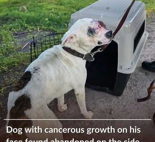 This poor dog was found with a broken chain around his neck on the side of the road with a bleeding mass on his face. Rescuers rushed him to a local veterinarian to be examined.