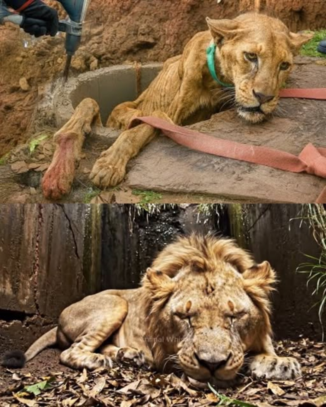 Once the lion was safely out of the well, the team immediately transported him to a wildlife center. There, he was carefully examined by veterinarians who provided the necessary treatment for his injuries, dehydration, and exhaustion. His physical condition was dire, but there was still a flicker of life in his eyes, a spark that told the rescuers that he wasn’t ready to give up just yet.