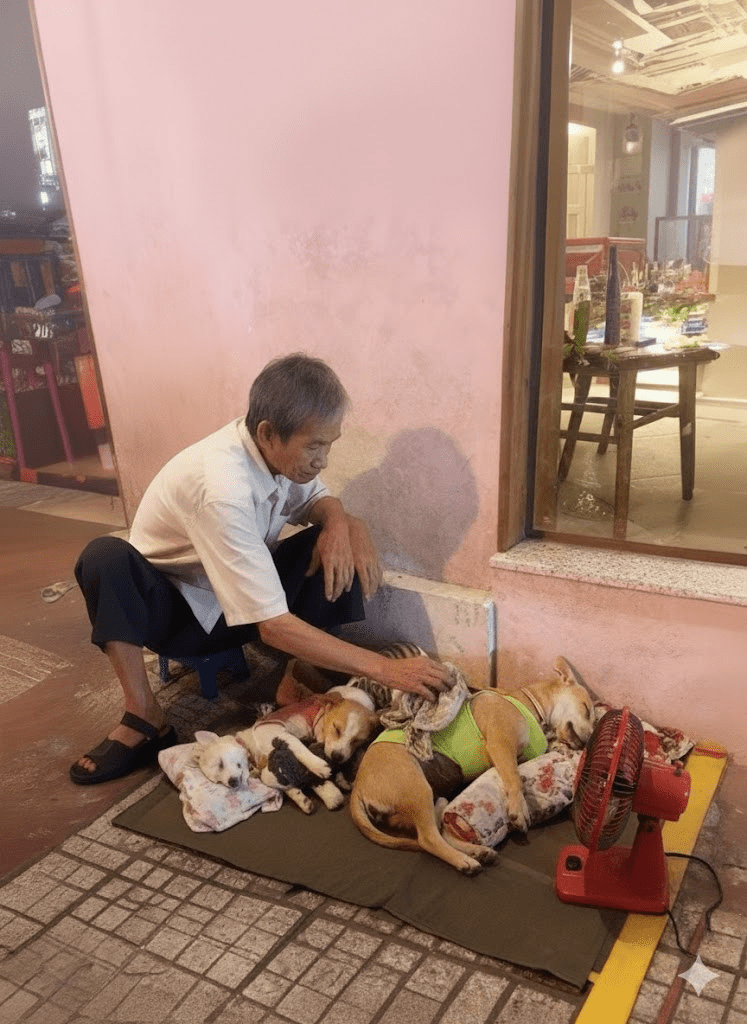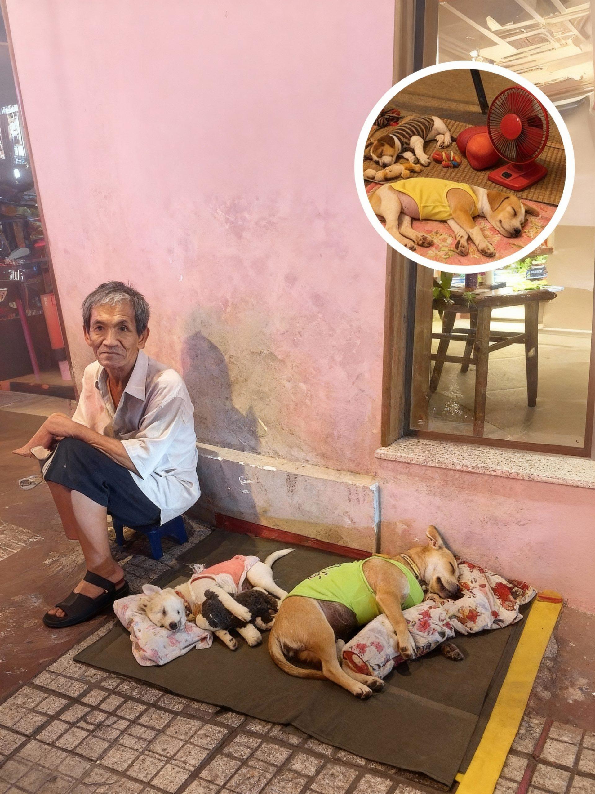 The small, circled inset image offers a deeper glimpse into the man’s dedication. It shows what appears to be an indoor or more sheltered arrangement for the dogs, complete with a small fan, highlighting his commitment to their well-being even in different settings. This detail is crucial; it suggests that his care isn’t confined to a single moment or location but is a continuous, thoughtful effort. The fan, a simple amenity, provides relief from the heat, demonstrating his attentiveness to their comfort. This consistent care underscores his unwavering commitment and love for these animals, painting a picture of a man who prioritizes their needs, finding innovative ways to ensure their safety and comfort, regardless of his own circumstances.
