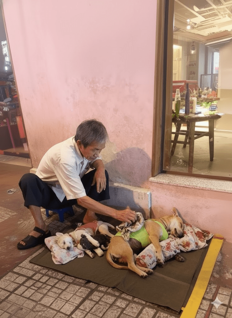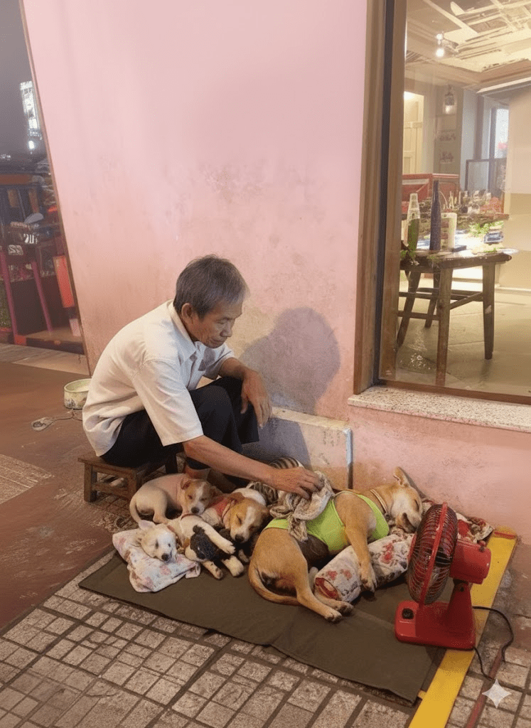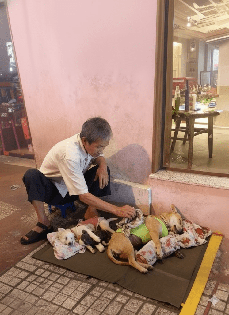 In a world often bustling with hurried steps and averted gazes, moments of profound humanity occasionally pierce through the urban din, reminding us of the enduring power of compassion. Such a moment is captured in this poignant image from the streets of Vietnam, depicting an elderly man seated beside his sleeping canine companions. This isn’t just a scene; it’s a narrative of unwavering devotion, a silent testament to the extraordinary bond that can form between humans and animals, especially in the face of adversity. The man, with his weathered face and modest attire, sits patiently, an unspoken guardian to the small pack of puppies nestled on makeshift bedding. Their presence is not merely incidental; it is central to his existence, a responsibility he shoulders with a quiet dignity that transcends his circumstances. The picture is not one of despair, but of a unique form of familial love, where the act of providing comfort and safety to these vulnerable creatures becomes the very fabric of his daily life. It’s a powerful visual that invites us to look beyond the surface and consider the deeper currents of empathy that flow through unexpected corners of our society, challenging our preconceptions about what it means to care, to be responsible, and to love without expectation.