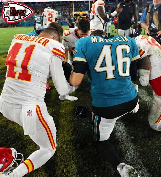 On a pitch lit up with lights last night, where cheers, disappointments, and joys mixed together, the Kansas City Chiefs suffered a bitter defeat against the Jacksonville Jaguars. However, what moved fans was not the scoreboard, but the moment after the final whistle — when players from both teams knelt in the middle of the field, held hands, and prayed.