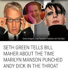 In a recent conversation on Bill Maher’s Club Random podcast, actor Seth Green unexpectedly recounted a shocking story — that in 2003, rock star Marilyn Manson punched comedian Andy Dick straight in the throat in the middle of a night out with friends. The story quickly gained attention and sparked much debate, not only about its veracity, but also about the “aggressor” image it portrays of Manson.