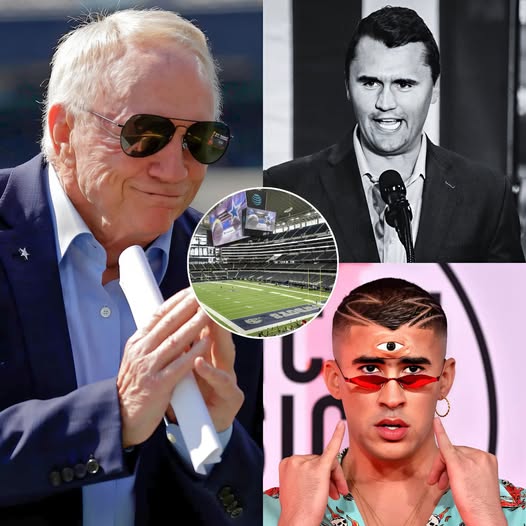 The world of sports and entertainment was set ablaze this week after reports emerged suggesting that Dallas Cowboys owner and president Jerry Jones is allegedly preparing to host a halftime event of his own at AT&T Stadium — one that would directly coincide with Bad Bunny’s globally anticipated Super Bowl performance. According to early leaks and unconfirmed insider accounts, the proposed event would center around a musical tribute to American singer Charlie Kirk, designed to appeal to audiences seeking a more traditional, homegrown flavor of American entertainment. Though the plans have yet to be officially announced by Jones or the Cowboys organization, the rumors have already ignited fierce debate, curiosity, and a wave of speculation across social media.