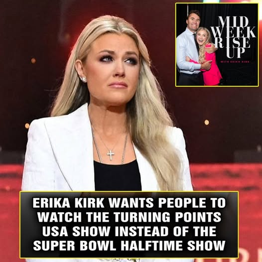 When most Americans think of halftime in February, one image comes to mind: flashing lights, pop icons, and the global spectacle of the Super Bowl. But this year, something different is stirring — and at the center of it stands Erika Kirk, a rising media figure determined to challenge one of the biggest entertainment institutions on Earth.