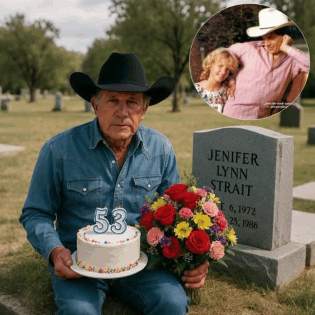Grief doesn’t age. It lives in our breath, in quiet places, in footsteps taken where someone no longer walks beside us. For George Strait, the loss of his daughter Jenifer in 1986 remains one such silence that fills rooms, hides in lyrics, and invites the world to sense without saying. On what would have been her birthday, he returned to her resting place with a bouquet and a moment of private communion. That image is a window—small, still—but it points to decades of sorrow, choices, and the way one man carried forward.