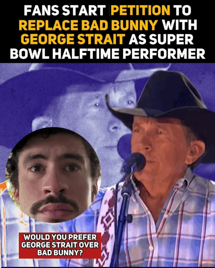 A new petition is making waves — it’s calling for country music icon George Strait to replace Bad Bunny as the Super Bowl halftime performer.