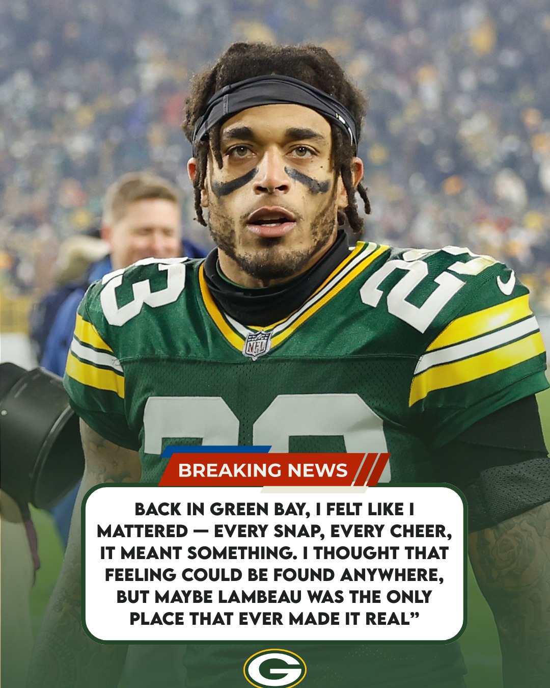 “Back in Green Bay, I felt like I mattered — every snap, every cheer, it meant something. I thought that feeling could be found anywhere, but maybe Lambeau was the only place that ever made it real.”