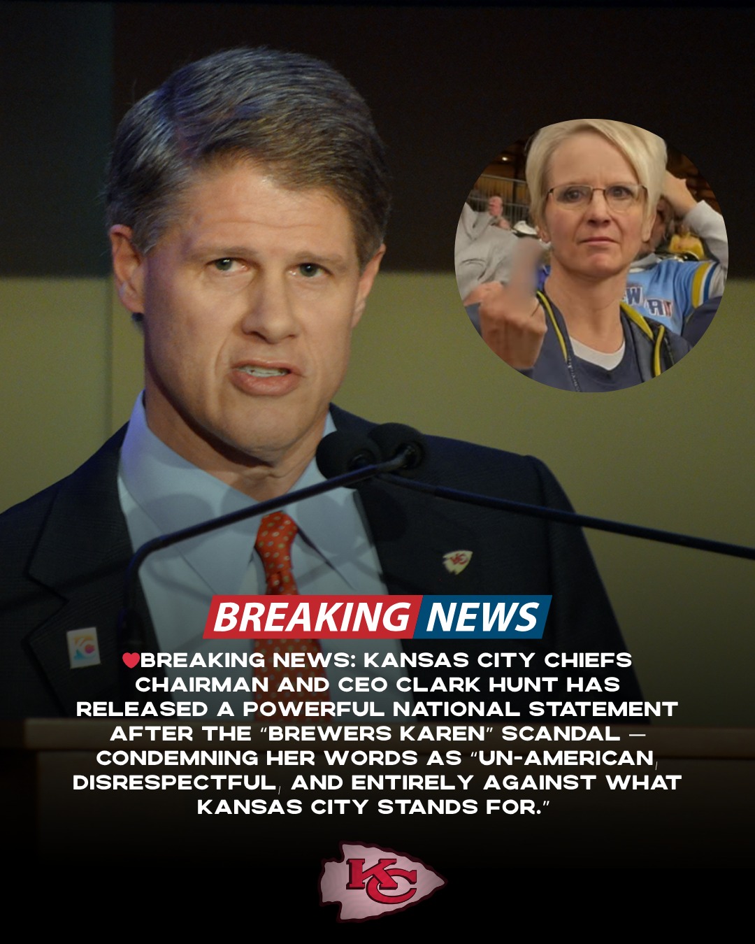 In a powerful and unprecedented statement, Kansas City Chiefs Chairman and CEO Clark Hunt has addressed the nationwide controversy surrounding the viral “Brewers Karen” incident, condemning the remarks made by Wisconsin woman Shannon Kobylarczyk as “Un-American, disrespectful, and entirely against what Kansas City stands for.” The message, delivered Thursday morning, immediately captured national attention and reinforced the Chiefs’ reputation as one of the NFL’s most community-driven organizations.