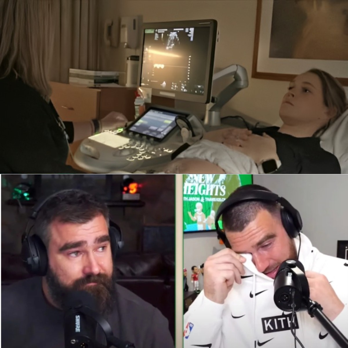 His brother, Jason Kelce, who recently retired from the NFL, sat quietly beside him, visibly emotional but composed. He placed a comforting hand on Travis’s shoulder as he continued.