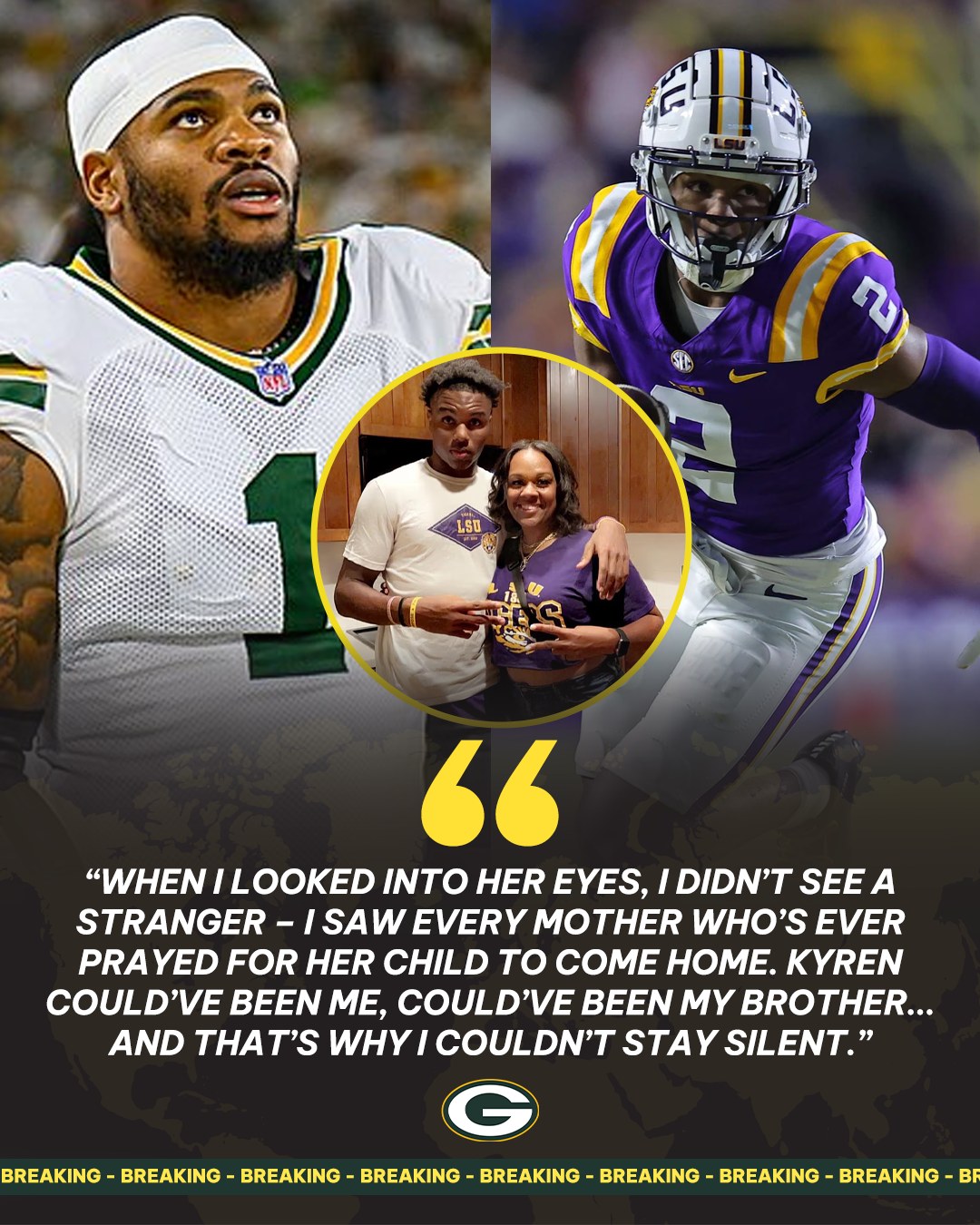 Kyren’s mother, speaking through tears, said the money was never the point. “It’s the kindness,” she told NBC Sports Wisconsin. “For months, we felt forgotten. And then an angel came wearing green and gold.”