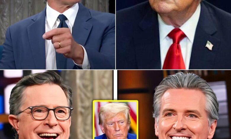 ss LIVE ON-AIR SHOCK: Gavin Newsom and Stephen Colbert DROP BOMBSHELL on Trump — The Unscripted Moment That Sent Washington Into TOTAL CHAOS.What began as a playful late-night exchange suddenly spiraled into an explosive confrontation — as Colbert and Newsom joined forces to reveal shocking insider details about Trump’s hidden network of influence. The audience gasped… and Washington hasn’t stopped talking since.