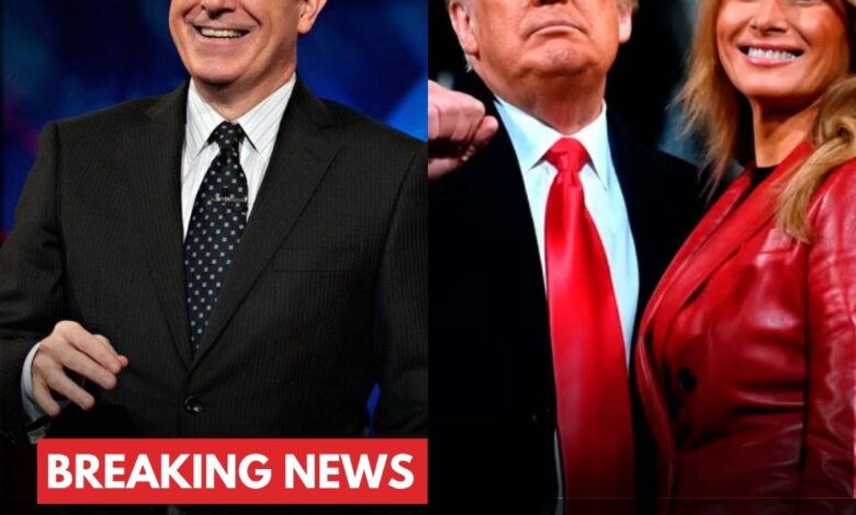 He pulled up a split-screen photo — Donald Trump at a rally, Melania standing several feet behind him. “If distance were emotion,” Colbert quipped, “that’s a restraining order.”