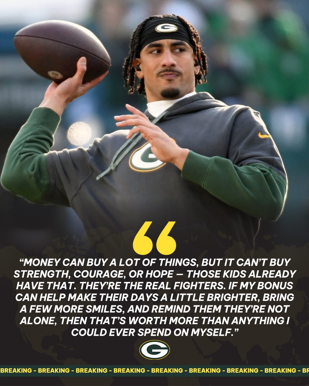 The rising NFL star announced that he’s donating his entire bonus to support over 1,000 children battling cancer in Green Bay hospitals and treatment centers. The funds will go toward covering medical costs, emotional care programs, and family support initiatives for young patients fighting for their lives.