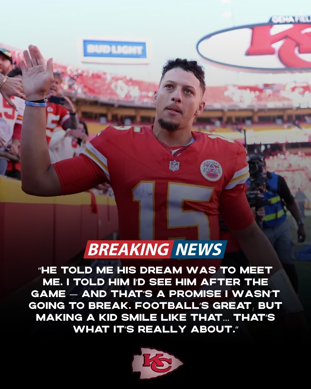 The story quickly spread across social media, with fans and fellow players alike praising Mahomes for his humility and heart. For many, it was a reminder that the face of the NFL isn’t just defined by touchdowns and trophies — but by moments like this, when the game’s biggest star keeps his smallest promise.