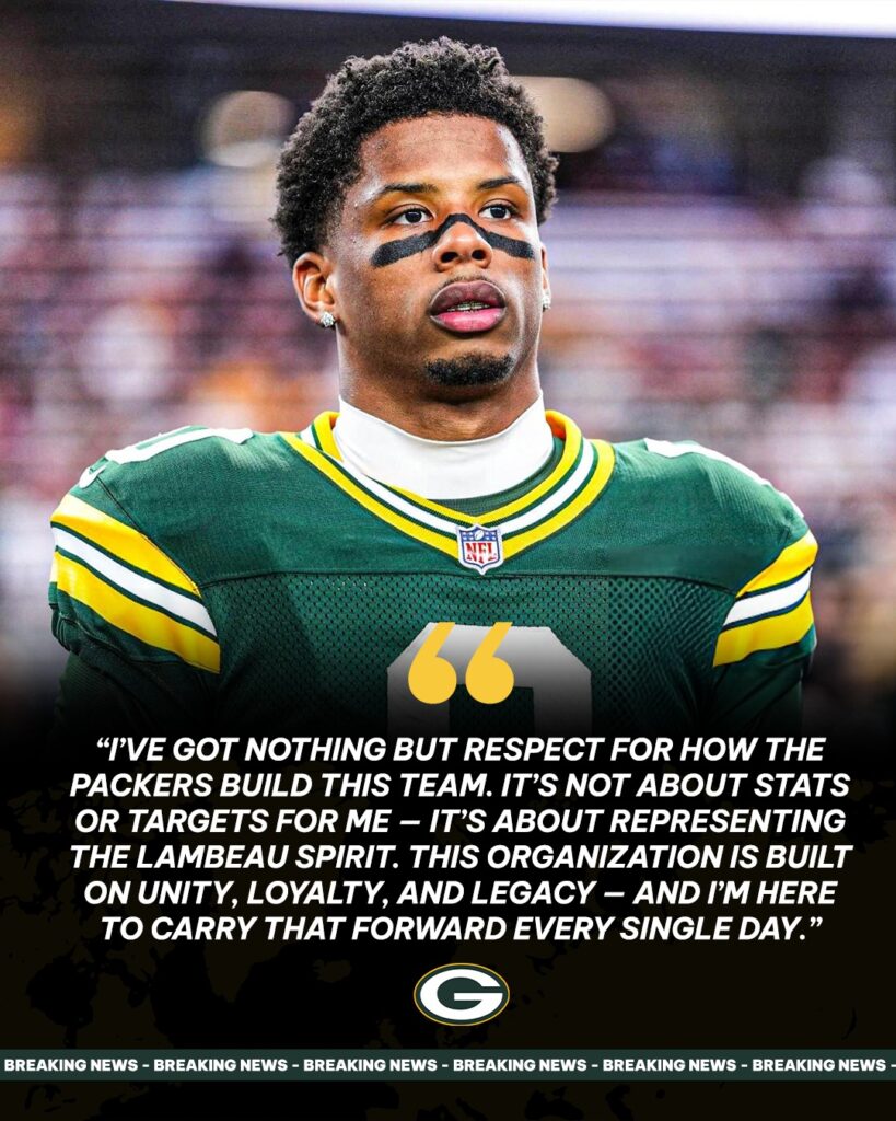 “I’ve got nothing but respect for how the Packers build this team. It’s not about stats or targets for me — it’s about representing the Lambeau spirit. This organization is built on unity, loyalty, and legacy — and I’m here to carry that forward every single day.”
